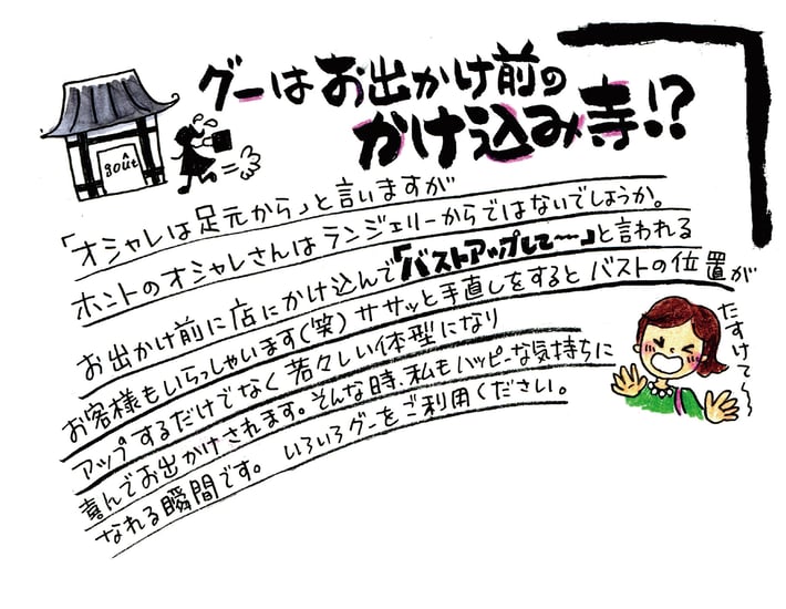 お店ができてもう35年になり、お陰さまで今まで一万人程のお客様のブラを採寸してきました。 お出かけ前に店に駆け込んで来られて「バストアップして!」と要望される方もいらっしゃいます(笑)ササッと手直しをすると、バストの位置がアップするだけではなく、若々しい体型になられ喜んでお出かけになられます。 まるで「かけこみ寺」のようで、私もハッピーな気持ちになれる瞬間です。