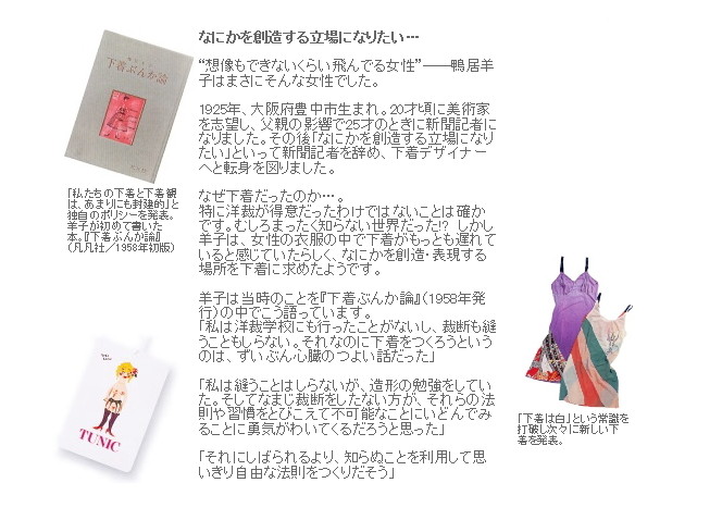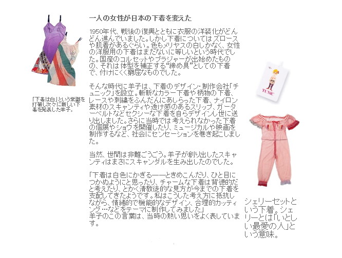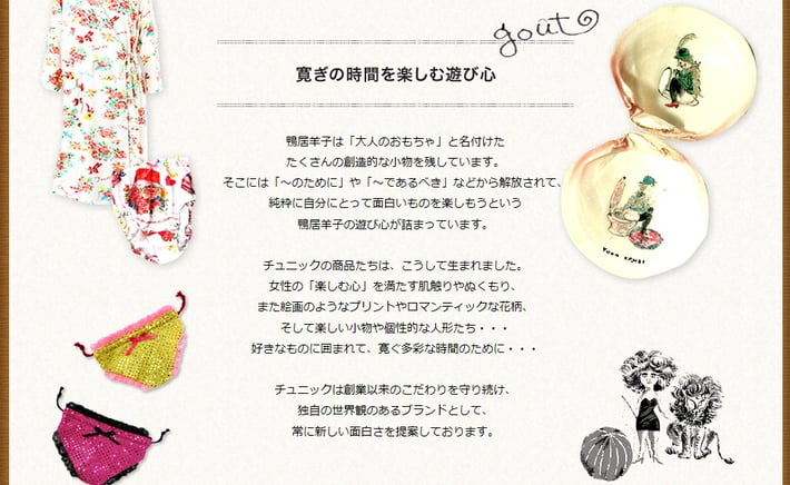 寛ぎの時間を楽しむ遊び心。鴨居羊子は「大人のおもちゃ」と名付けた創造的な小物をたくさん残しています。そこには「~のために」や「~であるべき」などから解放されて、純粋に自分にとって面白いものを楽しもうという メッセージが込められています。そんな心意気を当時の女性に持ってもらいたかったのです。チュニックの商品たちは、こうして生まれました。女性の「楽しむ心」を満たす肌触りやぬくもり、また絵画のようなプリントやロマンティックな花柄、そして楽しい小物や個性的な人形たち・・・好きなものに囲まれて、寛ぐ多彩な時間のために・・・チュニックは創業以来のこだわりを守り続け、独自の世界観のあるブランドとして、常に新しい面白さを提案しています。